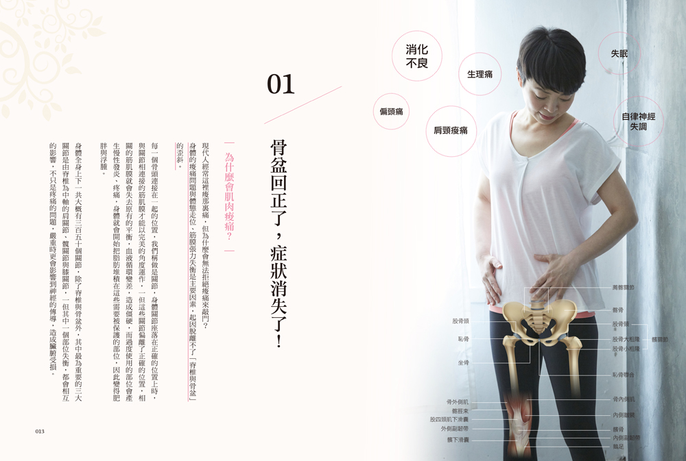 ‧當骨盆回到正確位置上,就能解除肌肉僵硬緊繃造成的全身痠痛、也能消除緊張,讓身體自然而然地放鬆。