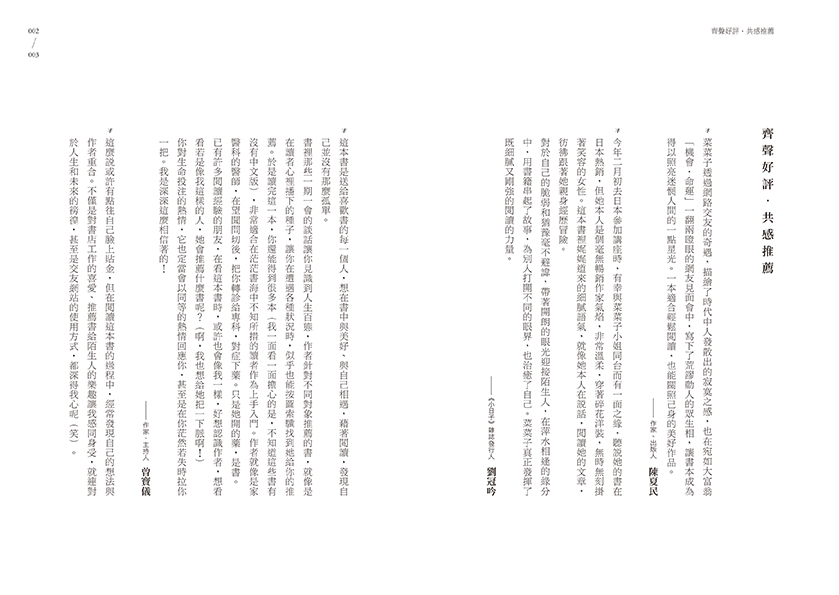 ◎對於自己的脆弱和猶豫毫不避諱,在萍水相逢的緣分中,用書籍串起了故事,為別人打開不同的眼界,也治癒了自己。菜菜子真正發揮了既細膩又剛強的閱讀的力量。——《小日子》雜誌發行人 劉冠吟