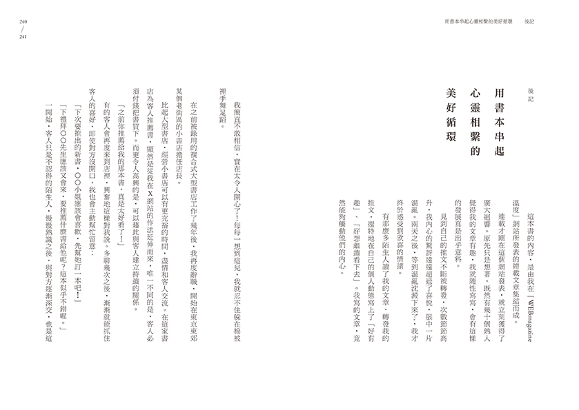 我的這趟旅行,啟程時搖搖墜墜、驚險萬分;現在,雙腳總算多少能夠碰著地面了。而且,我就像是被初次瞧見的美景所吸引的孩子,完全入迷了。雖然還稱不上游刃有餘,不過,回想當天見面的網友,竭盡心思為對方挑選最適合的一本書,然後發私訊推薦給對方,這樣的過程依然讓我樂在其中。
