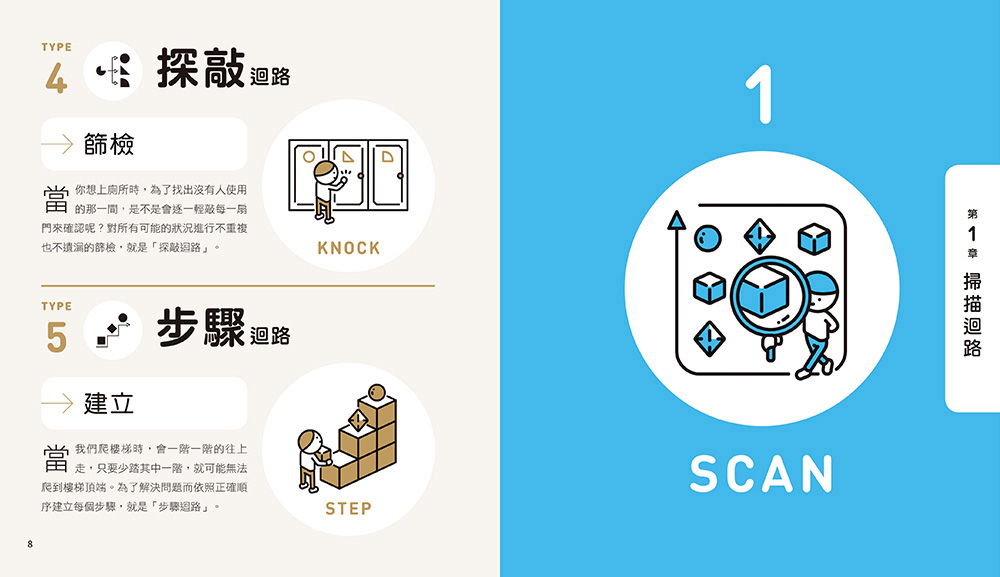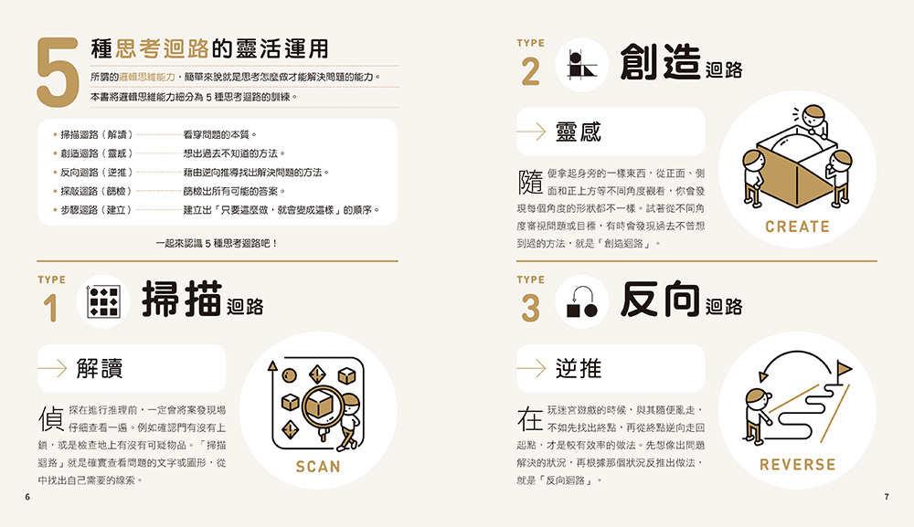書中分為掃描、創造、反向、探敲和步驟等5種思考迴路,正是邏輯思考和解決問題的五大面向,一道又一道關卡引領我們得到從多面向看待問題的能力。