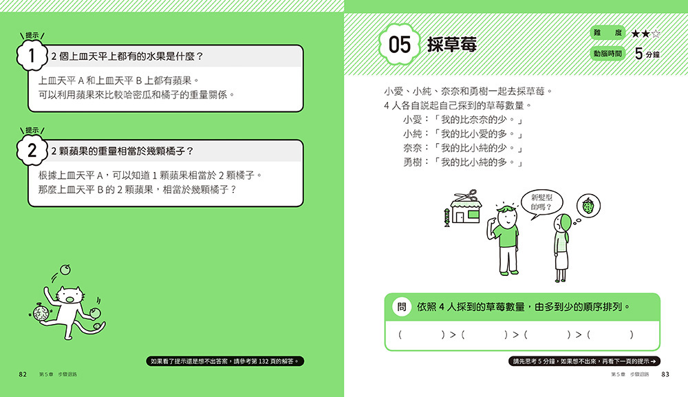 如果你不喜歡計算和思考,這些問題更是為你所設計,趣味的題目加上引導思考的提示,只要5分鐘,就能讓你的邏輯思維能力大大提升。