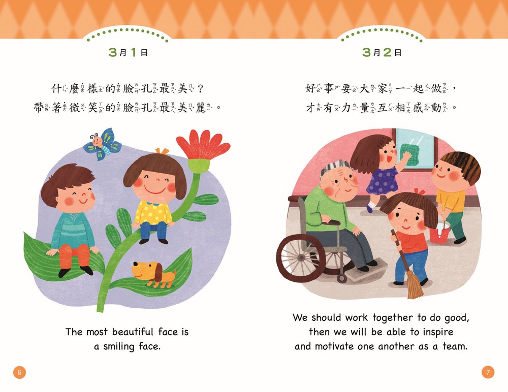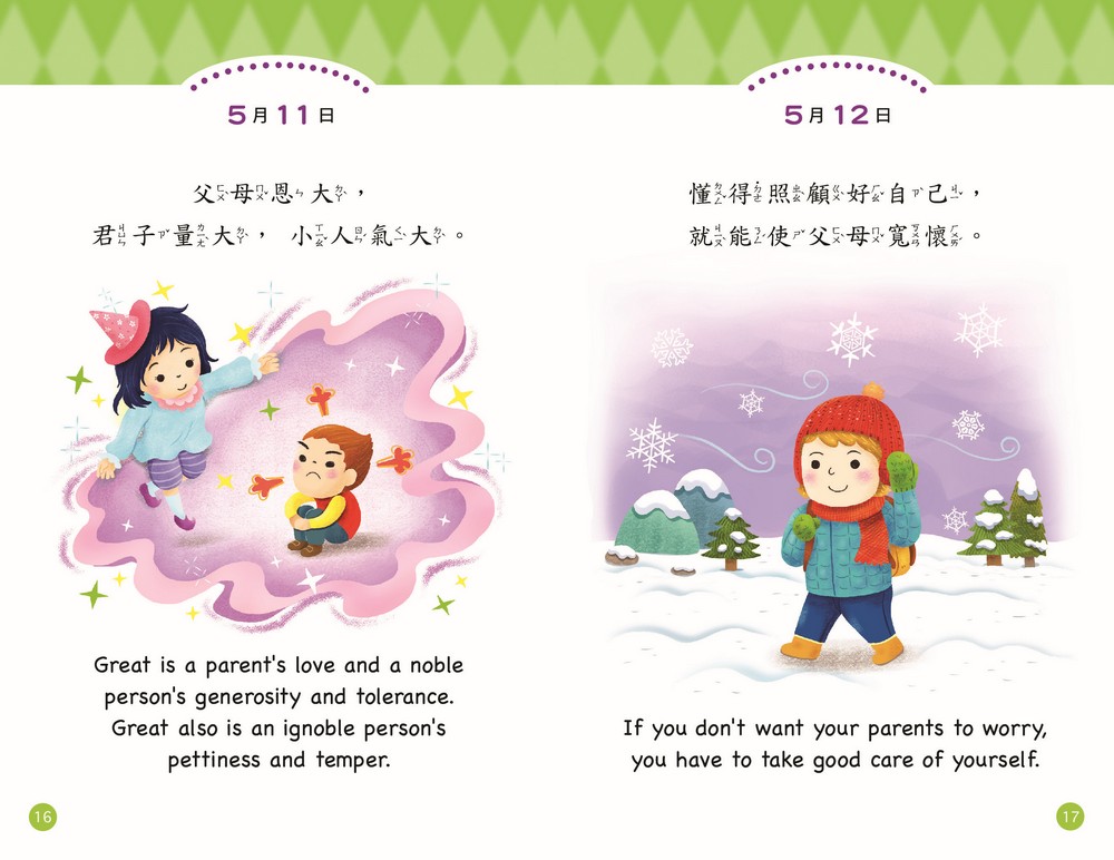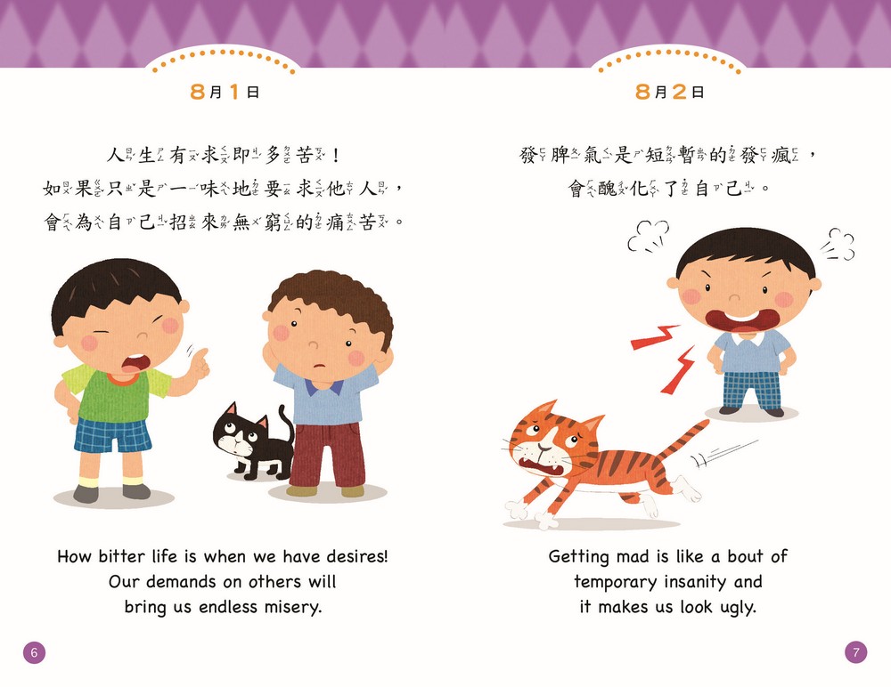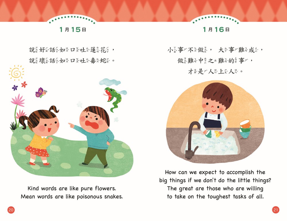 天天跟著書中標示的日期誦讀一則,天天領會靜思語的精神並落實在生活中。中英雙語搭配貼近生活的插畫,美好的文字和圖像,提升孩子氣質與品德。