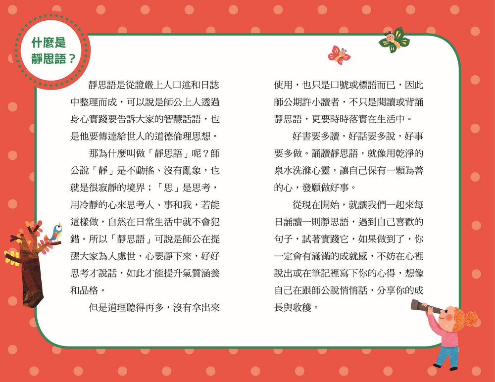 但是道理聽得再多,沒有拿出來使用,也只是口號或標語而已,因此師公期許小讀者,不只是閱讀或背誦靜思語,更要時時落實在生活中。