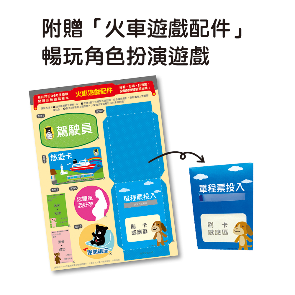 還有,別忘了搭配隨書附贈的「火車遊戲配件」,包括駕駛員名牌、車票、投票箱、悠游卡、讓座貼紙等。遊戲過程中,鼓勵孩子揣摩火車司機或形形色色的乘客特徵、表情、動作等,不僅能夠訓練孩子的觀察力和模仿能力,還可以幫助他們發揮想像力,更有組織的使用詞彙創造故事,有助於提高口語表達能力,以及學習社交禮儀、應變能力、合作和溝通技巧,建立自信。