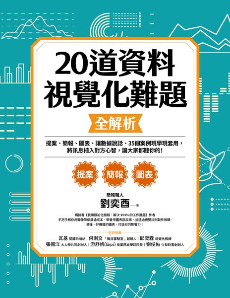 蒐羅作者劉奕酉簡報提案、企業內訓常碰到的20道視覺化難題,並依照每道難題提出解方及關鍵思考,讓視覺化不再是憑感覺、靠天分的美術創作,而是可依循、有步驟的聰明對策。