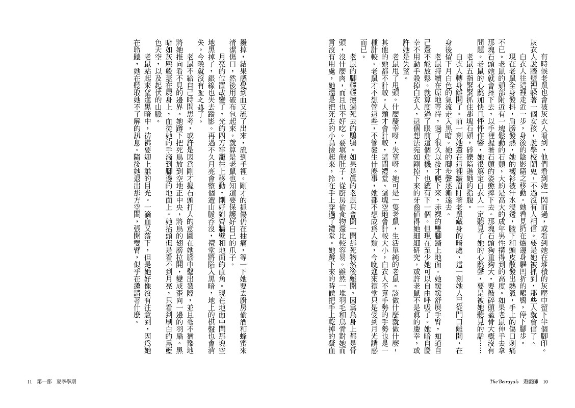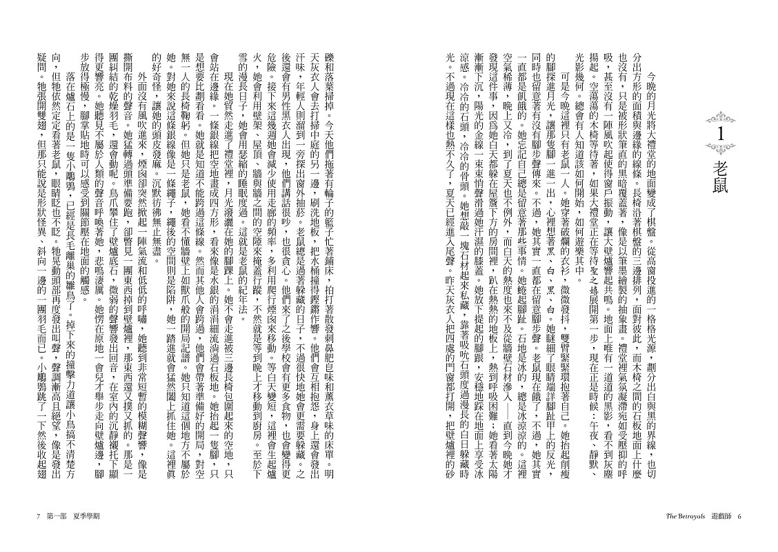 可是今晚這裡只有老鼠一人。她穿著破爛的衣衫,微微發抖,雙臂緊緊環抱著自己。她抬起削瘦的腳探進月光,讓那隻腳一進一出,心裡想著黑、白、黑、白。她瞇細了眼睛端詳腳指甲上的反光,同時也留意著有沒有腳步聲傳來。不過,她其實一直都在留意腳步聲。老鼠現在餓了,不過,她其實一直都是饑餓的。她忘記自己總是留意著那些事情。她蜷起腳趾。石地是冰的,總是冰涼涼的。這裡空氣稀薄,晚上又冷,到了夏天也不例外,而白天的熱度也來不及從牆壁石材滲入──直到今晚她才發現這件事,因為她白天都躲在屋簷下方的房間裡,趴在熱熱的地板上,熱到呼吸困難;她看著太陽漸漸下沉,陽光的金線一束束悄聲滑過她汗濕的膝蓋。她放下提起的腳跟,安穩地踩在地面上享受冰涼感。冷冷的石頭,冷冷的骨頭。她想敲一塊石材起來私藏,靠著吸吮石頭度過漫長的白日躲藏時光。不過現在這樣也熱不久了,夏天已經進入尾聲。昨天灰衣人把四處的門窗都打開,把壁爐裡的砂礫和落葉掃掉。今天他們拖著有輪子的籃子忙著鋪床,拍打著散發刺鼻肥皂味和薰衣草味的床單。明天灰衣人會去打掃中庭的另一邊,刷洗地板,把水桶撞得鏗鏘作響。他們會互相抱怨,身上還會發出汗味,年輕人則溜到一旁探出窗外抽菸。老鼠總是過著躲藏的日子,不過很快地她會更需要躲藏。之後還會有男性黑衣人出現,他們講話很吵,也很貪心。他們來了之後學校會有更多食物,也會變得更危險。接下來這幾週她會減少使用走廊的頻率,多利用爬行煙囪來移動。等白天變短,這裡會升起爐火,她會利用壁架、屋頂、牆與牆之間的空隙來掩蓋行蹤,不然就是等到晚上才移動到廚房。至於下雪的漫長日子,她會用瑟縮的睡眠度過。這就是老鼠的紀年法。