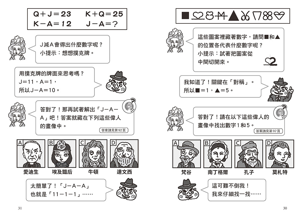 原本僅在課本或厚重名人傳記中才能看到的世界偉人,有的個性直爽、有的樂天知命,還有些一急起來脾氣就變得焦躁……他們以活靈活現的姿態出現在精采的故事中,雖然部分內容和人物的性格為虛構,但搞笑的情節設定,融合了偉人的生平事蹟,再加上一個又一個好玩有趣的遊戲,絕對讓你一頁接著一頁,迫不及待的想找出幕後的犯人。