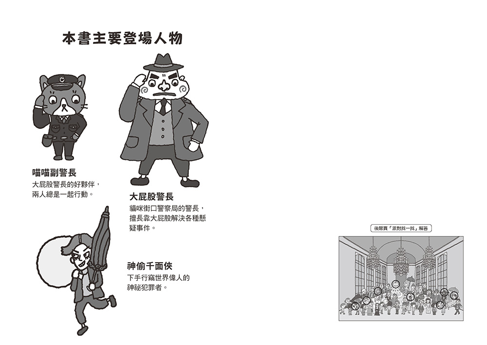我也想跟大屁股警長一樣,和不同時代的歷史人物一起參加盛會!書中一個接一個的逗趣謎題,有點小挑戰、好玩又有記憶點,能讓孩子快速認識世界偉人。故事與插畫皆輕鬆可愛,是適合低中年級的遊戲型讀本!──Childrening替孩子選好知識書