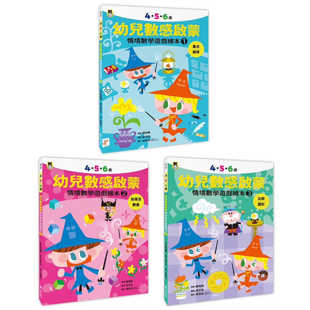每個孩子都愛聽故事、玩遊戲。《4.5.6歲幼兒數感啟蒙:情境數學遊戲繪本》共3冊,引導孩子興味盎然的跟著故事角色和畫面情境玩闖關遊戲,例如第1冊,庫夫和美蒂樂兩位數學魔法師,為了前往數字王國,必須辨認顏色和形狀、懂得組合和分類,找出排序規律性、認識序數和基數,以及判斷方位等;第2冊,庫夫和美蒂樂一路追查神偷的足跡,必須比較數量多寡、計算加法和減法、認識十進位法,還要會看月曆和時鐘等;第3冊,大家想為魔法王國的國王籌備生日派對,必須比較大小、長短、高低、容量和重量,以及掌握圖形組合、展開和結構等。如此,孩子便能在解題的過程中,不斷循環運用「思考」、「挑戰」、「理解」的學習體驗,有系統的進行數感訓練。