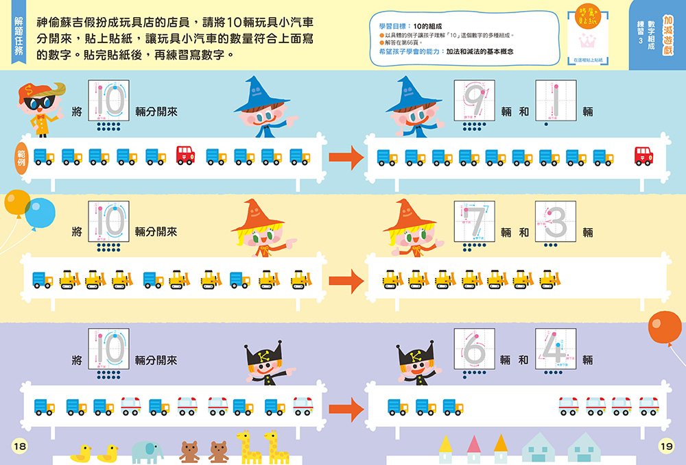3.玩出數感:每個跨頁遊戲皆標示解題任務、學習目標和希望孩子學會的能力,亦結合書寫、連線、著色和圈選,並附貼紙黏貼等活動。解題過程中,孩子不斷循環運用「思考」、「挑戰」、「理解」的學習體驗,有系統的進行數感訓練。