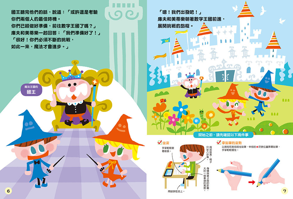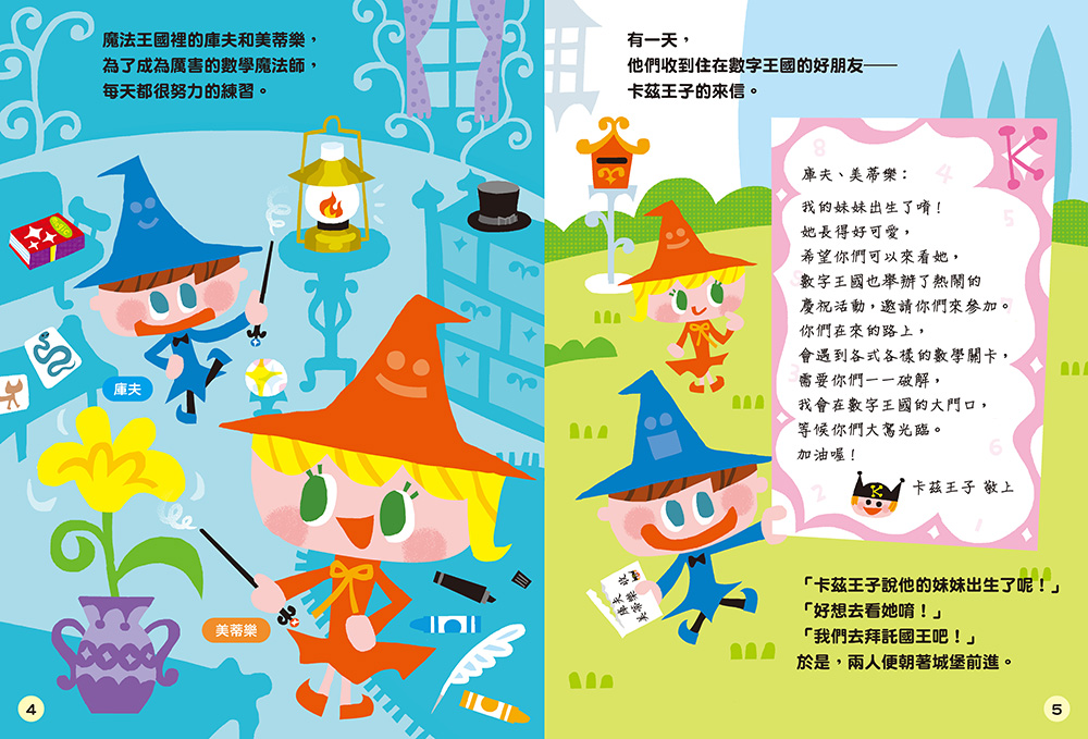 1.繪本故事:魔法王國的庫夫和美蒂樂,為了成為厲害的數學魔法師,他們前往數字王國、追查神偷的足跡、為國王籌備生日派對,帶著小讀者一起完成數學解題任務的闖關遊戲。