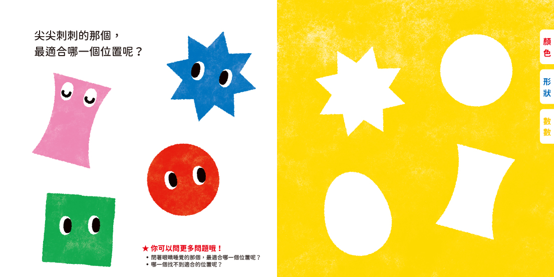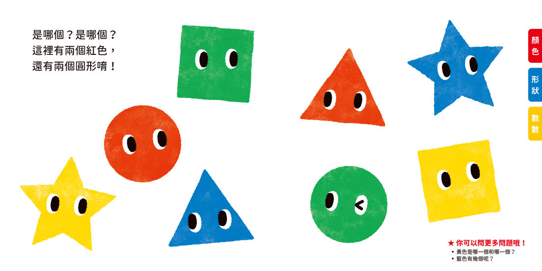 「數量」概念對年幼孩子如果太難,爸媽可以先從「顏色」、「形狀」等孩子已知的概念開始玩。當孩子認識4種主要形狀和顏色的名稱,就可以問:「有幾個圓形呢?」或「不是正方形的有幾個呢?」當孩子正確說出「4個!」而你給予讚美時,孩子就會很有興趣繼續挑戰。萬一孩子還不能理解「不是……有幾個」的問題,沒關係,有需要隨時翻回前面圖形數量較少的頁面玩,慢慢的孩子認知力越玩越好,思考判斷的答題成功率越來越高,孩子就會越玩越有信心,越玩越起勁哦!