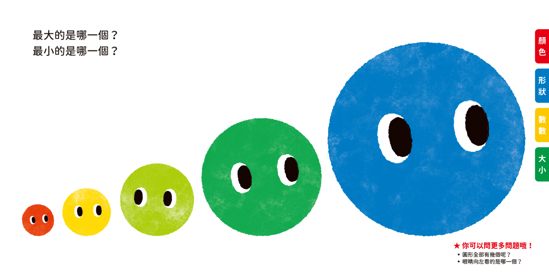 年齡較小的幼兒注意力較低,喜歡一直翻書,爸媽可以不停留在某一頁,而是一頁一頁翻讓他指出貫穿全書的主角「紅色圓形」在哪裡。年紀較大的幼兒的觀察力相對較好,生活經驗也較多,就可以問:「哪一頁紅色圓形不只一個呢?」或「你發現了嗎?紅色圓形怎麼都沒有閉眼睡覺呀?」你想孩子會怎麼回答呢?