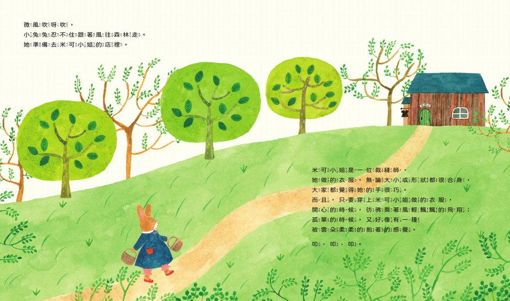 森林裡有一位手藝靈巧的裁縫師,米可小姐,她做的衣服,無論大小或形狀都很合身,穿上她做的衣服,開心時就像乘著風飛翔;孤單時,又像被雲朵柔柔的抱著。