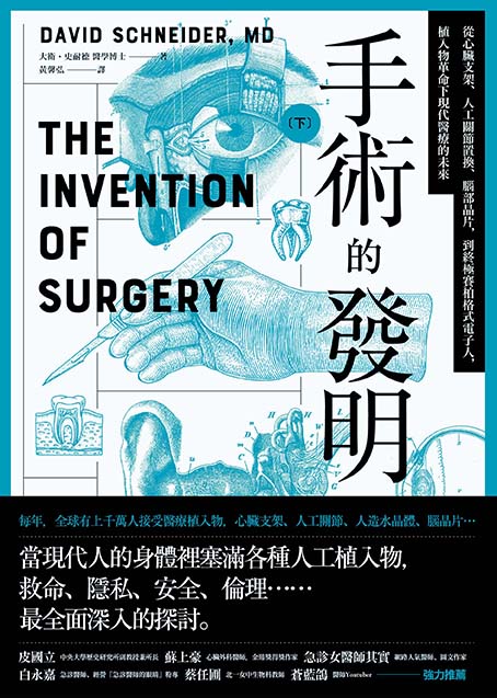 著名史家羅家倫(一八九七~一九六九)指出:「人事間相互的推動和影響,也和自然界受到動力的支配一樣,越近的力量越大。用一個粗率的比方來說,好像水中拋了一個石子,最近的圈子所受的推動最大,越遠的越淡下去了」「要知道人類或民族過去的來歷和演進、現在的地位和環境,以及他將來的生存和發展,都非研究他近代的歷史不可。」故我認為本書著重近代西方世界的寫作策略,無疑是具新穎性且更為重要的,更何況市面上已有許多西方醫學史或外科史的各種專著或科普著作出版,若再寫一本一模一樣的著作,實在無甚新義。相反地,本書作者本身就是一位經驗豐富的外科醫師,所以對手術過程的描述、專有名詞的掌握,都具有很高的專業度。更重要的是,他以慧眼獨具的專業觀察,發現我們正處在一場歷史變局與革命當中,準確來說,這份創新就是植入物,甚至稱為永久植入物,乃由塑膠、金屬、有機、生物和電子材料製成。