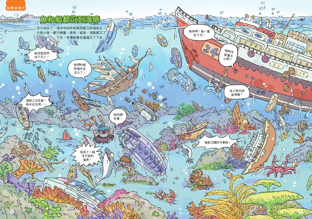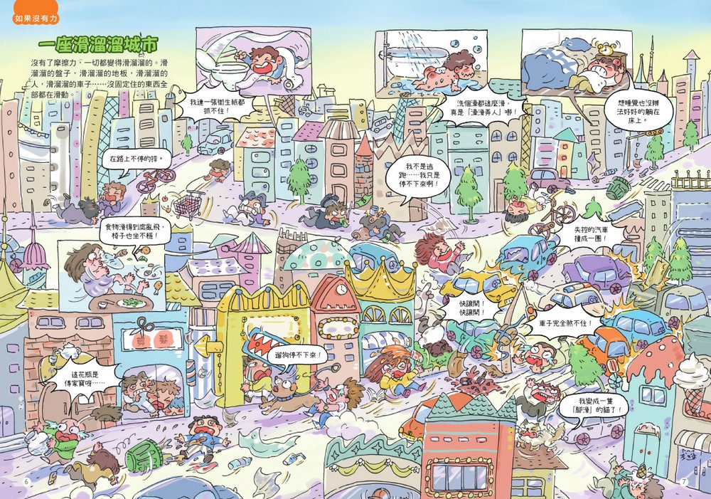 開篇有多張跨頁大圖,充滿天馬行空的瘋狂想像,人類住家或自然景象,變成一團混亂──讓小讀者感覺又好笑又好玩!勾起孩子探索物理世界的興趣,主動思考沒有了〇〇的生活,是什麼樣子?進而對於背後物理原理提出問題,這也是自主學習的基礎。
