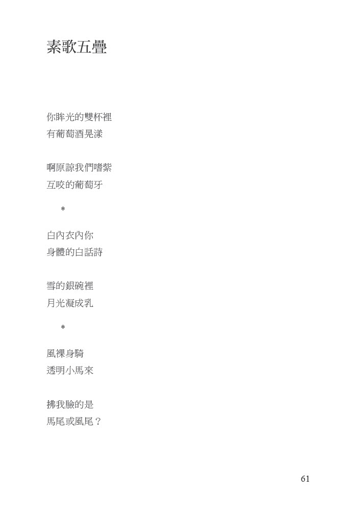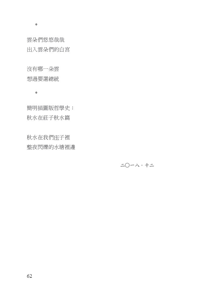 我要感謝四十多年來的老友、文友、樂友──懸壺三重的醫師作家莊裕安,半年多來週週包容我的電話訴苦、求援以及近乎騷擾的不安詢問,助我仍有餘勇讓此本跨越八年的拙集得以殺青(啊,多希望順便將心中的「青蛇」──憂鬱之蛇──也殺掉!)。也要感謝日夜照料我,忍受我的不耐,身上苦痛數倍於我,卻仍要在我每夜服藥就寢後,將諸多家事做完始能休息的我的妻子。我只能在膽怯的詩行中向她、向其堅毅致愛、致敬。我也要感謝在各種時段,突然接獲我電話,聽我反覆嘮叨、傾訴,以「話療」助我小命至今仍在的各方親友、學生。
