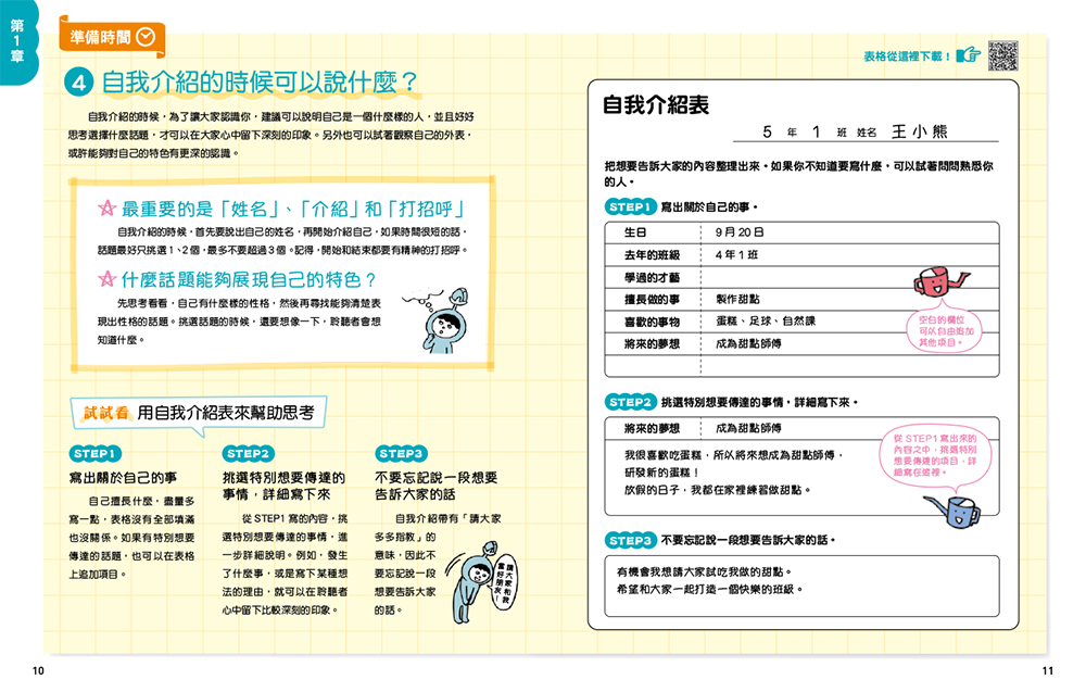 這個單元還有提升準備和練習效率的各式表格填寫範例,如「自我介紹表」、「讀書會表格」、「簡報表格」、「採訪表」、「意見整理表」、「討論紀錄表」、「辯論比賽主張表」等,也可掃描QRcode下載空白表格。每冊書末亦附有便於使用的空白表格,可直接影印。