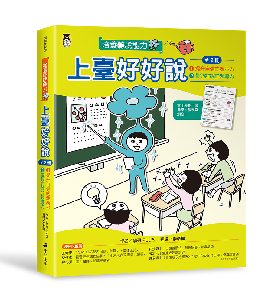 本套書共2冊,採用引導式自我學習法,從練習到上臺,引導孩子自主學習發表與討論的能力。透過模擬生活情境,點出同學的煩惱,先提出問題,再提供解決之道和實作練習,有如一堂真人老師在旁指導的說話課。