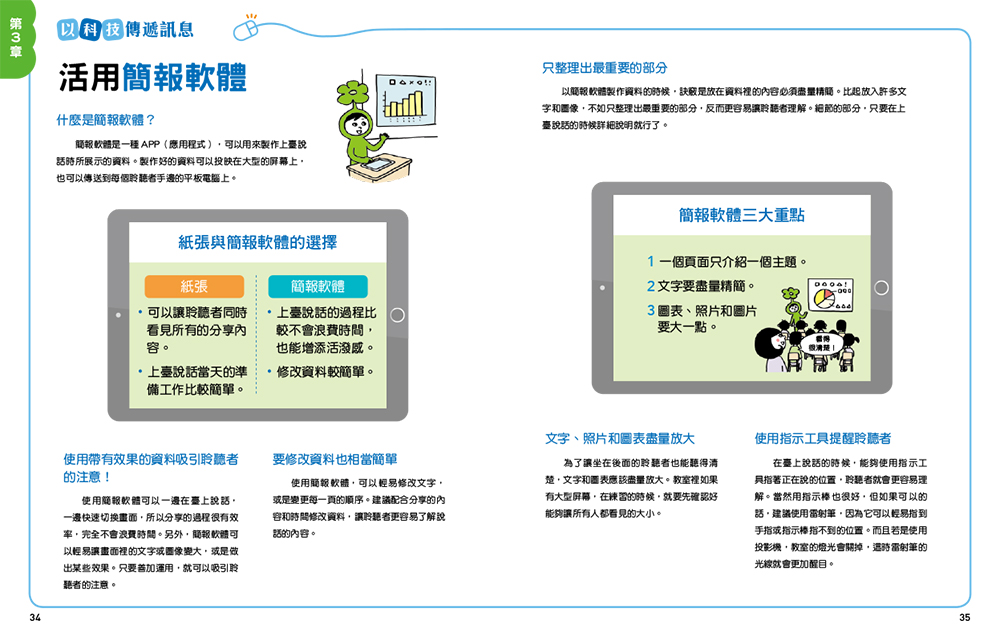 ◆「以科技傳遞訊息」單元:分享如何善用數位工具來製作資料、上網蒐集資料、活用簡報軟體吸引聆聽者注意與理解、運用網路連線進行採訪和討論……讓上臺說話與科技接軌,事半功倍。