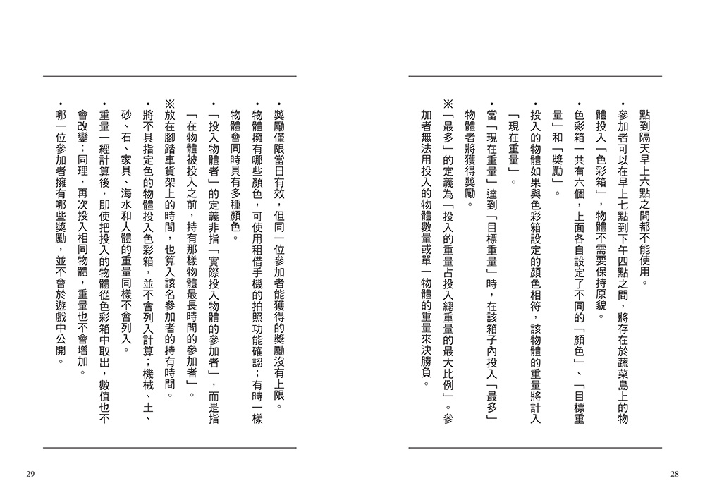 參加者比之前更加激烈擺盪的心情,還有蔬菜島豐富多元的樣貌,himesuz都完美的用插圖一一呈現,請搭配精采的故事一起享受。