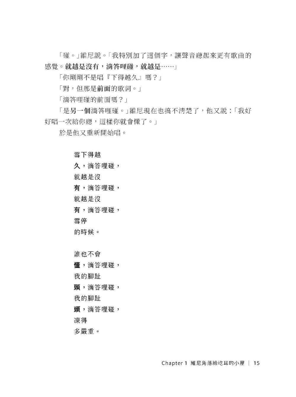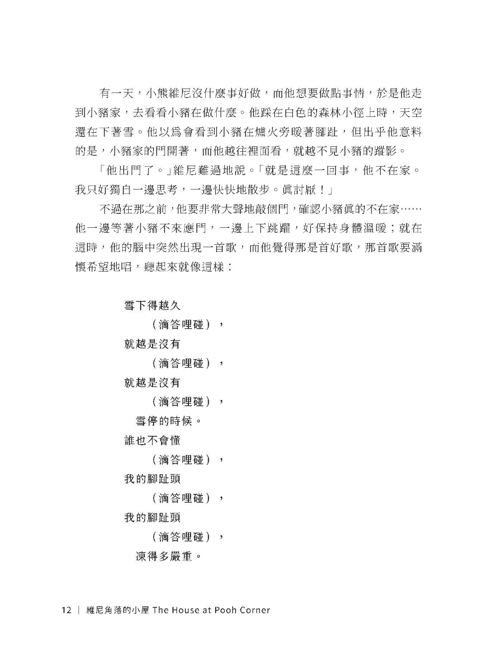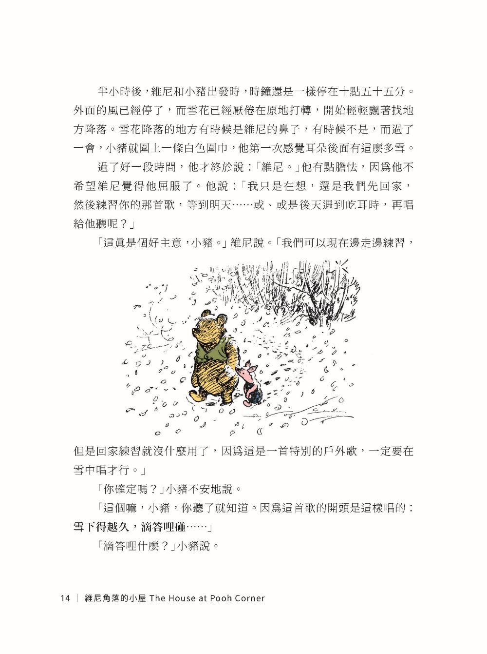 維尼和小豬慢慢地跟在他後面走。一路上,小豬一句話也沒說,因為他什麼也想不到;維尼也一句話都沒說,因為他正在想一首詩。想出那首詩後,他便開始唸: