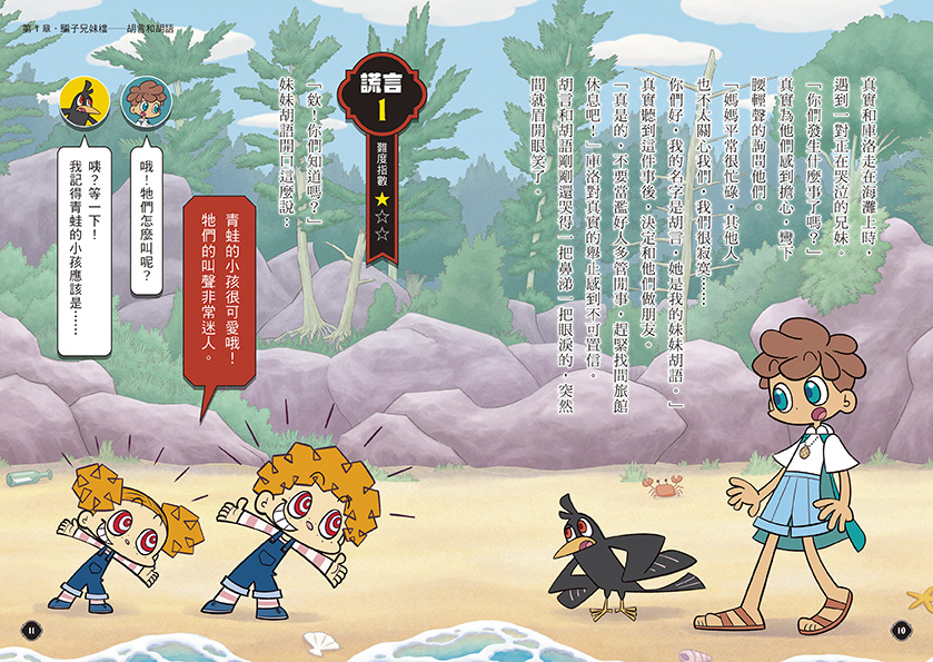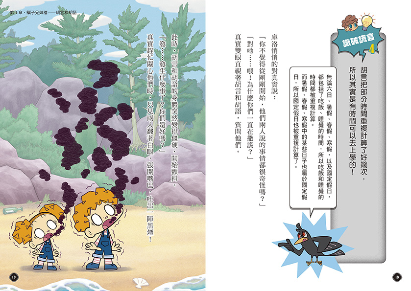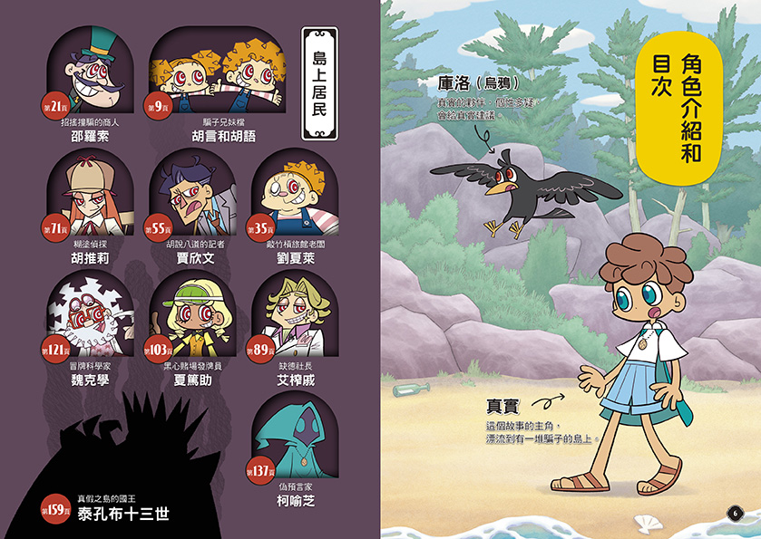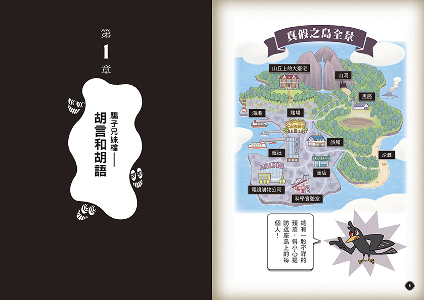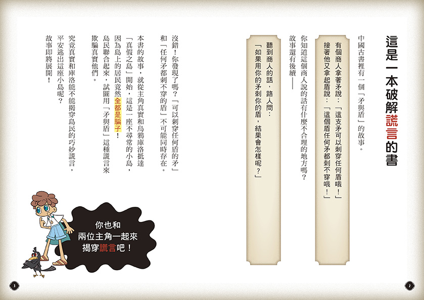 全書共設計40則謊言謎題,涉及自然、數學、魔術、錯覺等各方面常識。打開這本解謎之書,讀者彷彿成為主角踏上詭異的真假之島,在重重危機中,必須時刻保持頭腦清晰。到處都是騙子的「真假之島」就像實境機智問答節目或密室逃脫遊戲,一旦答案錯誤就無法前進,甚至須遭受懲罰,但只要善用推理分析能力,即可瞬間破解騙局逃出生天!讓我們跟隨真實和庫洛,運用閱讀力、學科能力,以及邏輯思維,從細節中揭開謊言的黑幕吧!