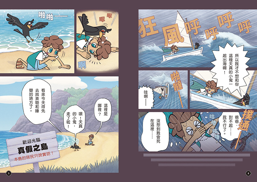 故事從男孩真實和他的夥伴庫洛漂流到「真假之島」開始!島上的居民看似良善,實則個個都是大騙子,從胡言亂語的小兄妹、招搖撞騙的商人、亂敲竹槓的旅館老闆、黑心賭場的發牌員,到罔顧真相的記者、偵探,甚至科學家……無不口若懸河,大玩話術、數字、視覺等騙人的手段,企圖將真實和庫洛困在島上永遠不得離開。