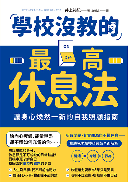 專門研究兒少心理的精神科醫師井上祐紀,見過無數拒學案例,更深入了解各種壓力導致的問題成因。他認為,休息並不等於壞或失敗,反而是一種「解決問題的手段」。本書將從釐清「休息」的意義開始,從青少年生活常見的問題出發,帶領讀者逐步了解自己的狀態,找回面對壓力與難題的勇氣,從而學會真正「讓自己休息」。