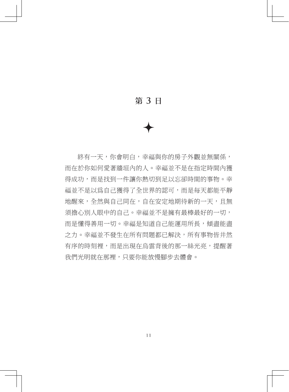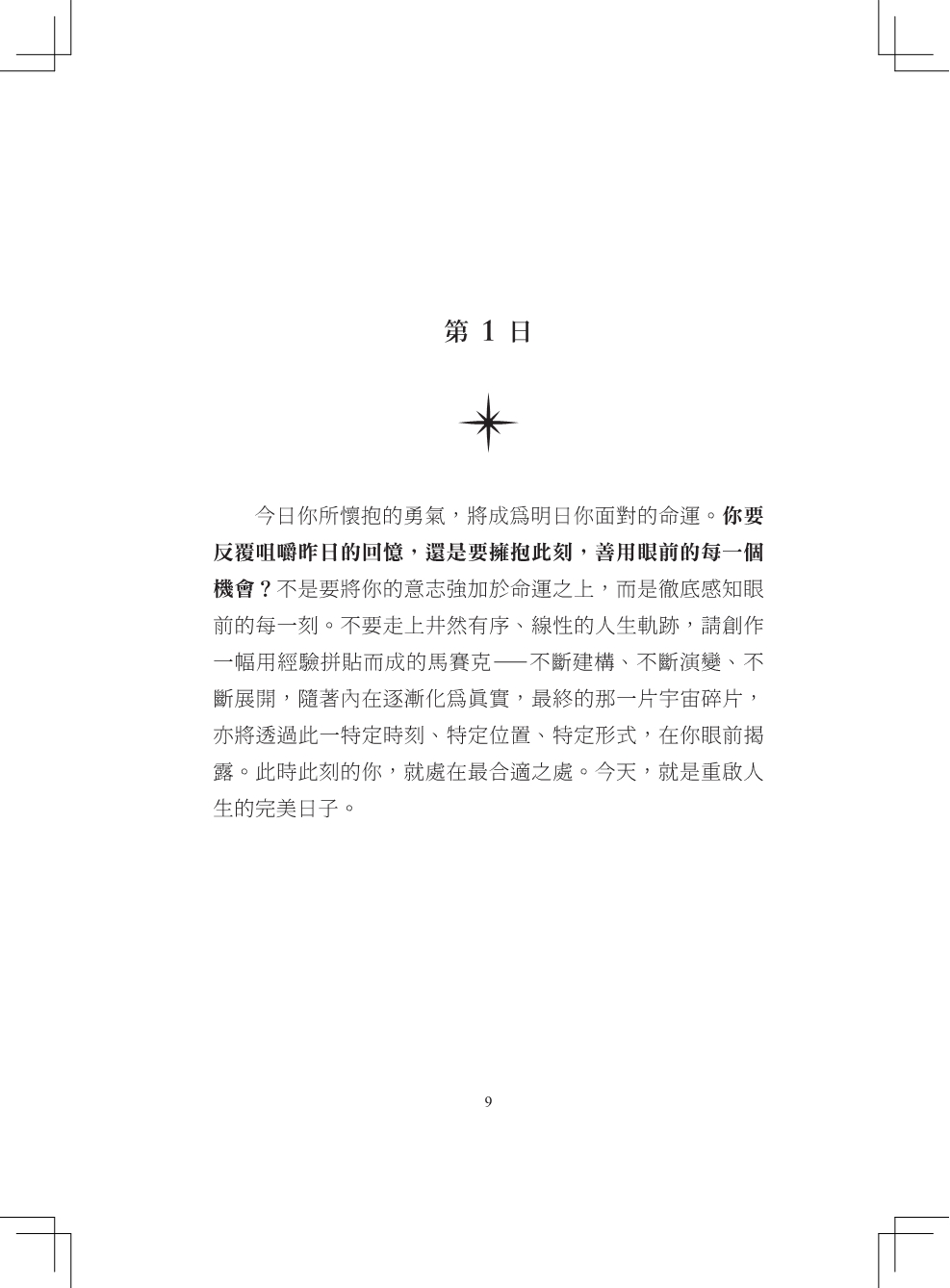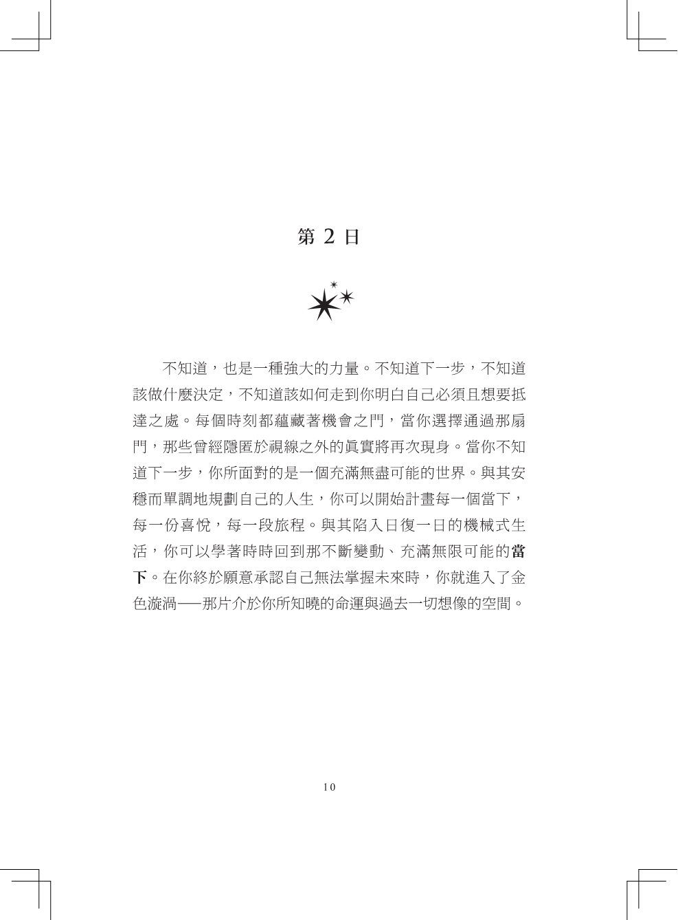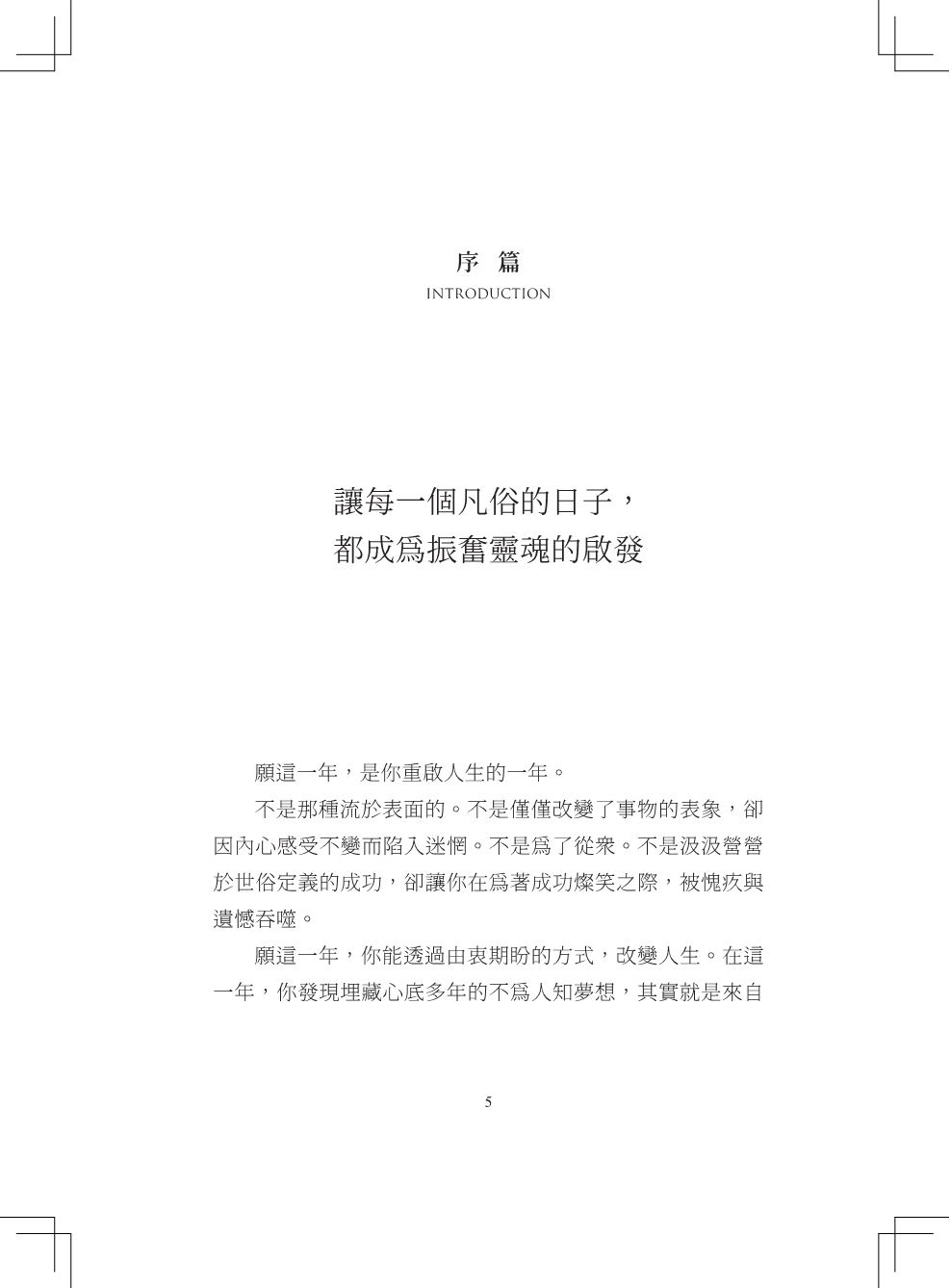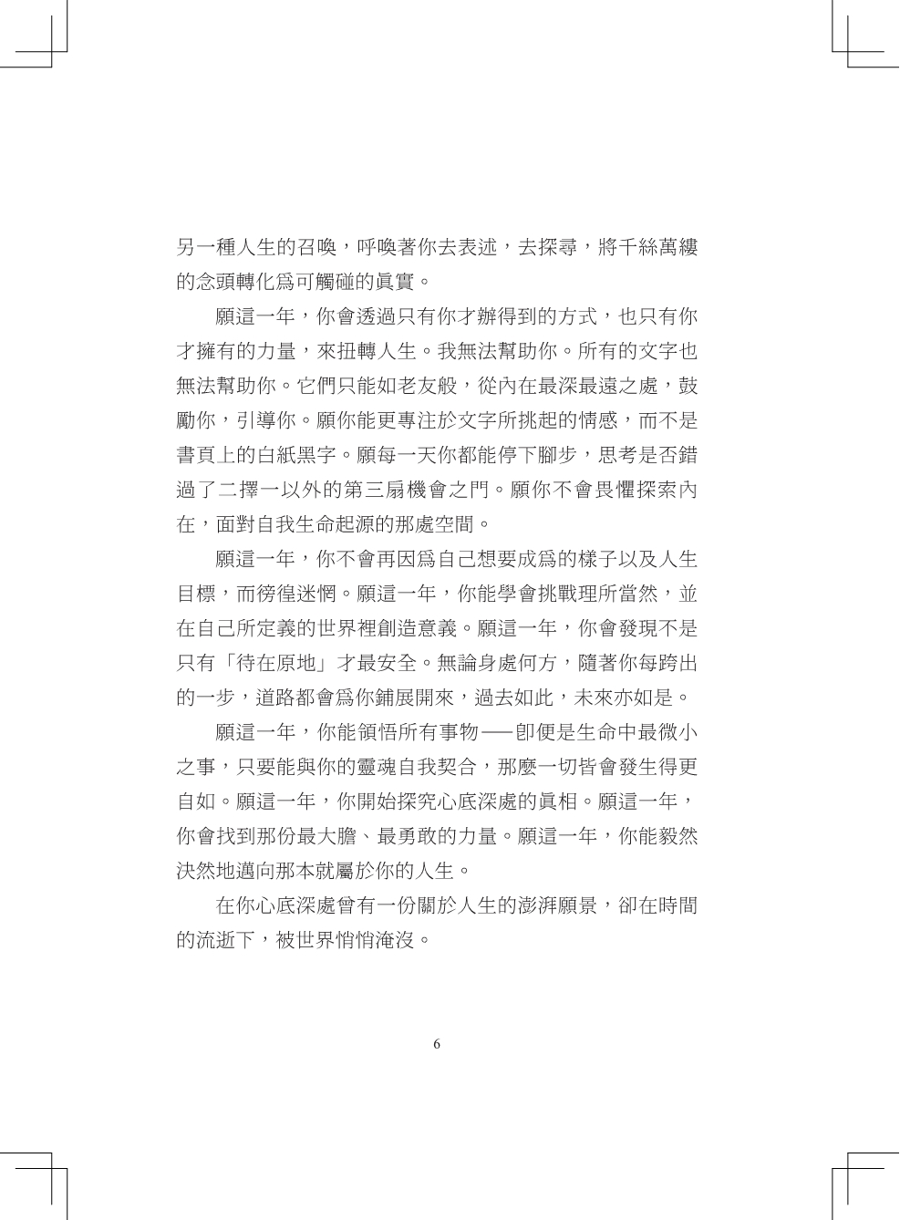 願這一年,你會透過只有你才辦得到的方式,也只有你才擁有的力量,來扭轉人生。我無法幫助你。所有的文字也無法幫助你。它們只能如老友般,從內在最深最遠之處,鼓勵你,引導你。願你能更專注於文字所挑起的情感,而不是書頁上的白紙黑字。願每一天你都能停下腳步,思考是否錯過了二擇一以外的第三扇機會之門。願你不會畏懼探索內在,面對自我生命起源的那處空間。