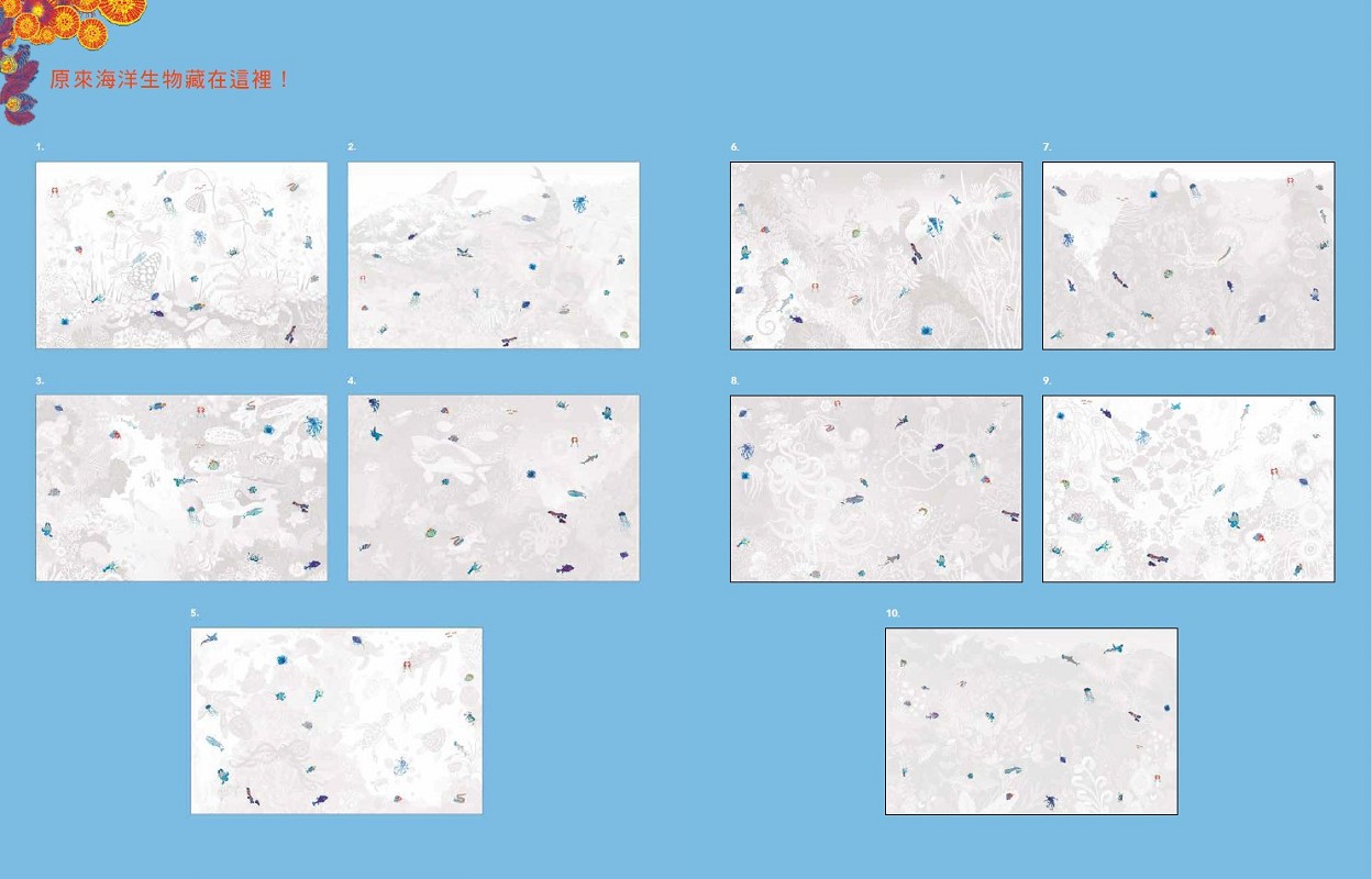 時間從清晨、白日、到夜晚,有珊瑚礁、岩礁、陸棚、深水層……等各種生態環境。鮮豔的色彩令人目不暇給,但是靜下心來,又可以慢慢揪出藏在裡頭的海洋生物身影。準備好挑戰你的眼力了嗎?