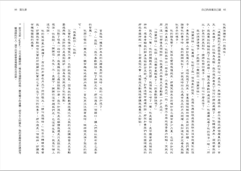 艾蜜莉翻了個白眼。「喔,說真的,法蘭西絲!放、下、這、件、事。」她強調了說出來的每一個字,像是咬下了一口又一口的清脆蘋果,配上蘿絲如白雪公主般的容貌、艾蜜莉發出的金色光芒,法蘭西絲突然覺得她們都像是童話故事裡的角色。然而,在童話故事中,當女巫告知你未來的命運時,你就得留神傾聽。