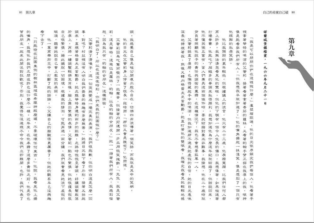 媽媽又拿起這封信,仔細研究它,好像它是什麼犯罪證據。「預言不是這麼說的。」她平靜地說。「預言是:你的未來將有一堆枯骨。當你以一隻手的掌心握住女王時,你的緩慢死亡就恰好開始了。小心那隻鳥,因為牠會背叛你。在那之後,就再也無法回頭了。但女兒是伸張正義的關鍵,找到恰好的那個女兒且讓她親近左右。所有跡象終將指向你的謀殺之謎。」