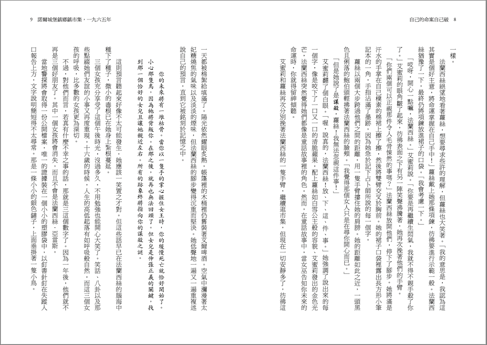 「那好吧。」我說,試著切換我最適合說故事的語調。珍妮接過酒瓶,將我的酒杯倒滿。「當時是一九六五年,法蘭西絲姑婆十六歲。她和她兩個最好的朋友去參加一個鄉鎮市集並算了命。法蘭西絲姑婆得知自己的命運預言:你將會被謀殺,最後變成一堆枯骨。」