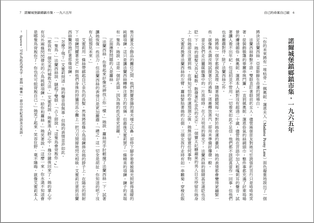 艾蜜莉挽著法蘭西絲的左臂,蘿絲緊貼著她的右側,三個女孩行走時有如一串雛菊,穿梭在販售古董及小飾品的攤位之間。他們對賣香腸的屠夫嗤之以鼻,卻停下腳步看看被陽光照射得溫暖的純銀項鍊。這只是讓法蘭西絲轉移注意力的伎倆,但最後艾蜜莉買了一條精美的項鍊,鍊子的末端有一隻鳥。她說,這是一個好兆頭,因為她的姓氏是史派羅。