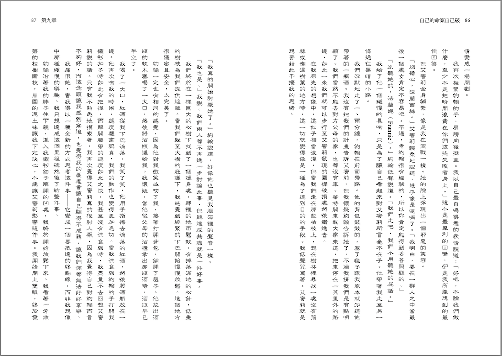 「那我有一個完美的補救方法。」艾蜜莉說。她衝進人群之中,幾分鐘後回來了。她的掌心中有另外兩條閃閃發光的小鳥純銀項鍊。「給你和蘿絲。」她笑著說。「這麼一來,你永遠不知道會是哪隻鳥背叛你了,你也有可能背叛自己。」她笑了起來,笑容狂野、毫不隱晦,就像艾蜜莉本人一樣。