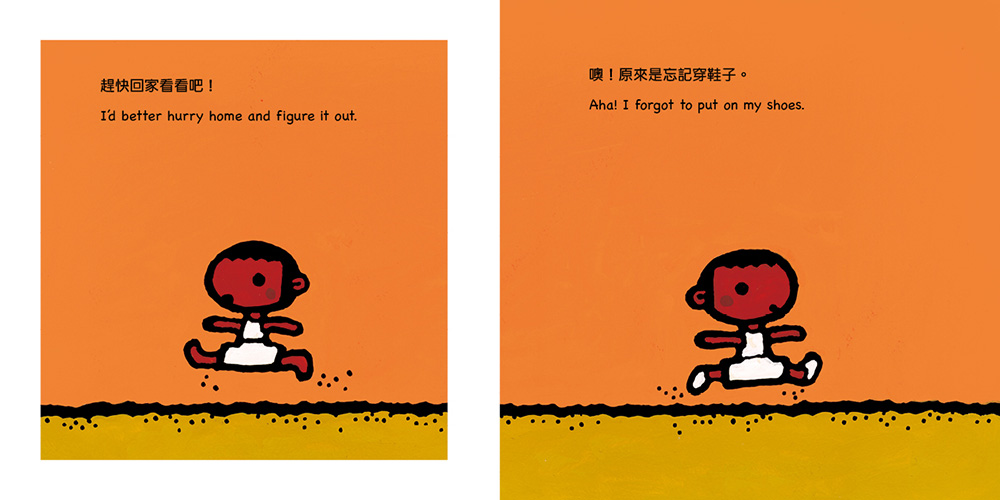 你的孩子覺得本書的主角是什麼動物呢?(據說五味太郎畫的是小猴子!)小猴子忘了穿鞋、忘了戴帽子、忘了戴幸運項鍊、忘了要去哪裡……這樣急急忙忙、丟三落四、不斷往返家裡的過程,令人莞爾,而爸爸一直是旁觀者,直到孩子需要時才伸出援手。「何時放手」、「何時出手」對父母而言,從來不是容易的事,看到書中爸爸的淡定,是否有助於減少「越看越著急、越著急越想幫忙」的念頭呢?