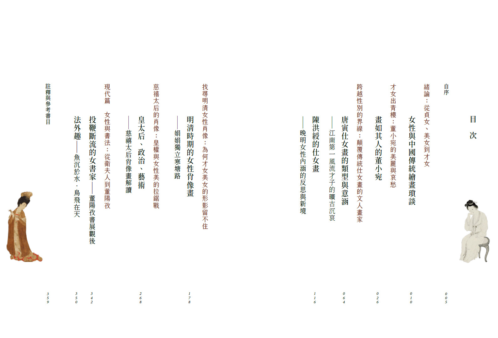 緒論首先回顧中國書畫藝術中的女性形象演變:從唐代以前宗教、道德規訓意味強烈的「貞女」,到唐富感官性、宋內省深沉,卻皆不脫男性凝視意味的「美女」,最後到明清時「才女」輩出,女性創作者終於從男性手中取回詮釋女性意象的權力,一些男性畫家描繪女性形象時,也不再視女性為被動的玩賞對象。