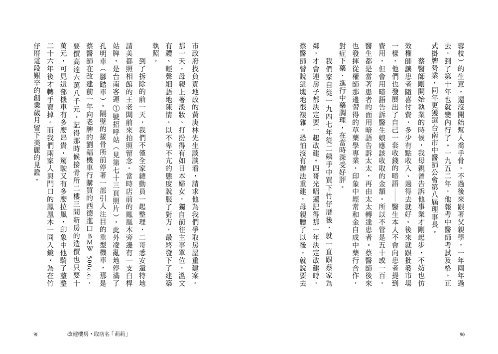 蔡醫師剛開始執業的時候,我母親曾告訴他事業才剛起步,不妨也仿效權師讓患者隨喜付費,多少有點收入、過得去就好。後來就跟批發市場一樣,他們也發展出了自己一套收錢的暗語──醫生本人不會向患者提到費用,但會用暗語告訴醫生娘應該收取的金額。所以不管是五十或一百,醫生都是當著患者的面用暗語告訴太太,再由太太轉達患者。蔡醫師後來也發揮從權師那邊習得的草藥學專業,印象中經常和金自成中藥行合作,對症下藥、進行中藥調理,在當時深受好評。