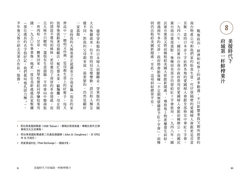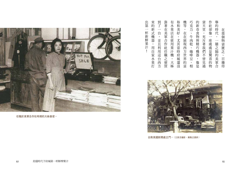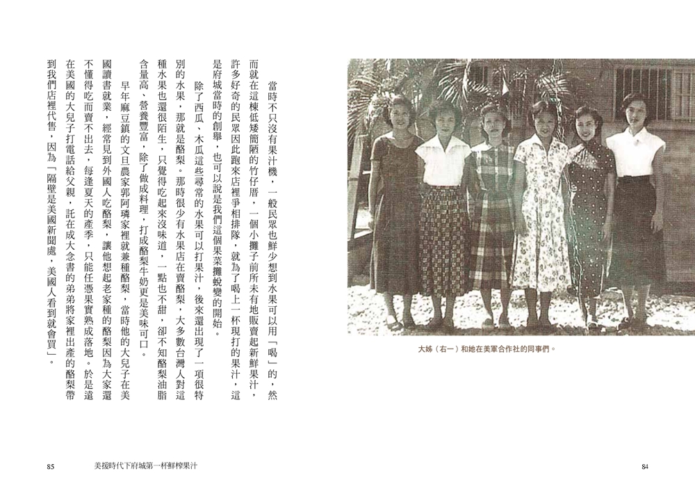 在那個物資匱乏、百廢待舉的時代,一牆之隔的美軍合作社卻像一座處處是驚喜的物資天堂,充斥著我們不曾見過的新奇食物與精巧機器,像是巧克力、牛肉乾、咖啡豆、相機等,在在展現西方世界的富裕和美好。尤其當時府城還沒有水果店在使用果汁機,大姊靠著在美軍合作社任職之便買到了一台,並且利用這台西方來的新式機器,用自家水果打出第一杯新鮮果汁!