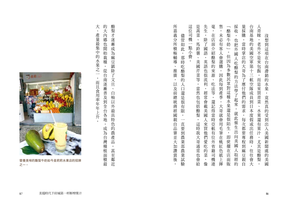 除了西瓜、木瓜這些尋常的水果可以打果汁,後來還出現了一項很特別的水果,那就是酪梨。那時很少有水果店在賣酪梨,大多數台灣人對這種水果也還很陌生,只覺得吃起來沒味道,一點也不甜,卻不知酪梨油脂含量高、營養豐富,除了做成料理,打成酪梨牛奶更是美味可口。