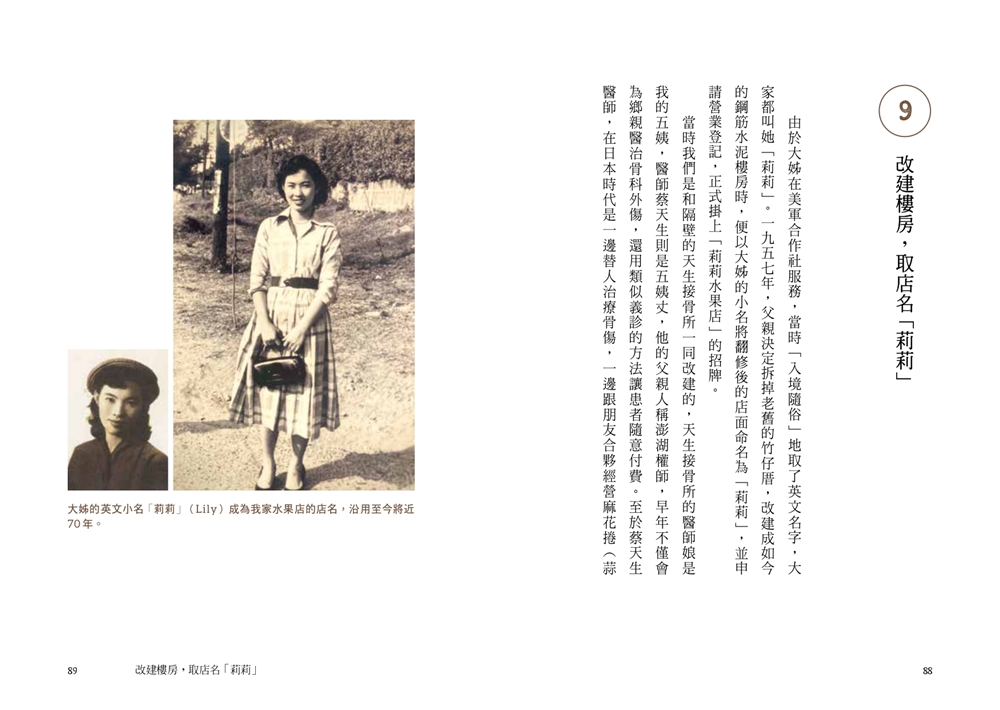由於大姊在美軍合作社服務,當時「入境隨俗」地取了英文名字,大家都叫她「莉莉」。一九五七年,父親決定拆掉老舊的竹仔厝,改建成如今的鋼筋水泥樓房時,便以大姊的小名將翻修後的店面命名為「莉莉」,並申請營業登記,正式掛上「莉莉水果店」的招牌。