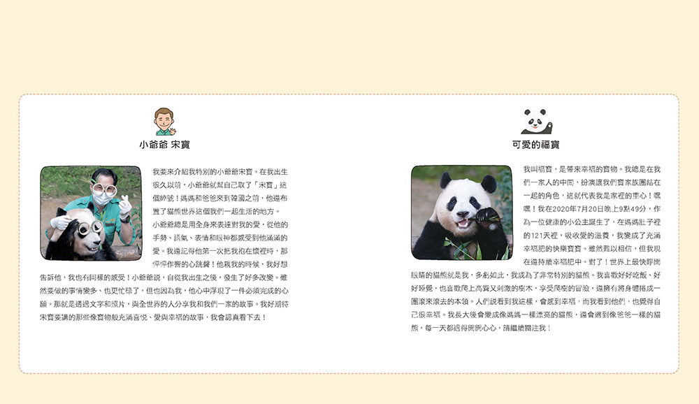 收錄超過260張珍貴照片,呈現福寶、愛寶和樂寶毛茸茸的幸福日常,書中也收錄宋爺爺寫給福寶的信,記錄福寶從出生到返中前的每個感人時刻。寫給一路陪福寶長大的你。