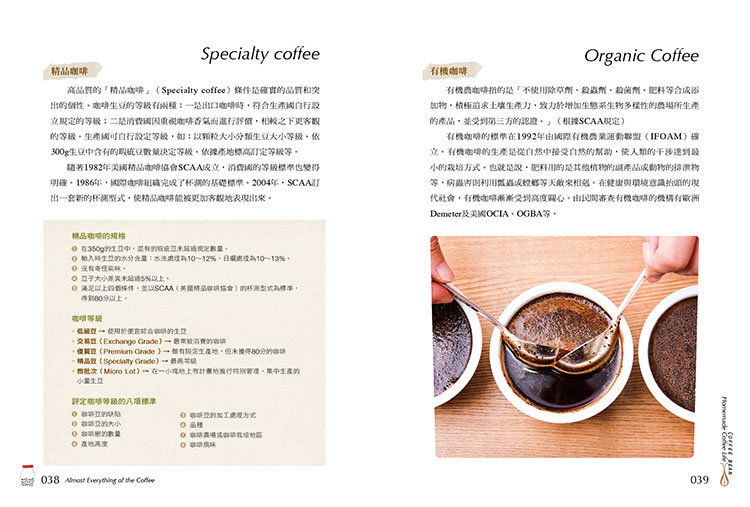 本書全方位介紹咖啡的一切,搭配近500張精美圖片,從栽種到採收,從加工到生豆,從選豆、烘豆到調豆,從研磨到萃取,從各種器具、味道搭配到特殊品項,再從歷史文化到產地之旅,讓你完整掌握咖啡的所有資訊、有趣常識、必要知識和沖煮技法,打造出個人專屬的咖啡風味和咖啡時光!