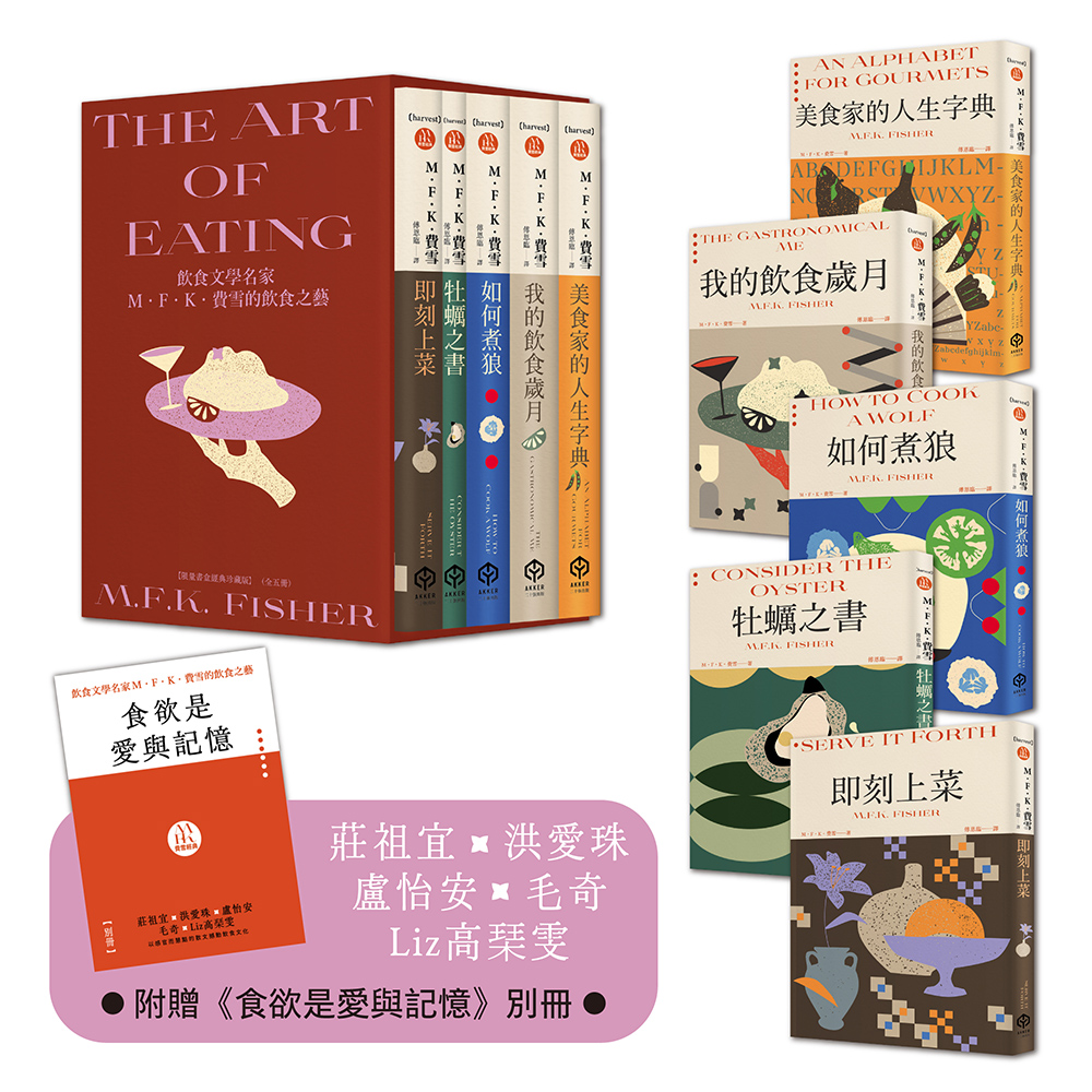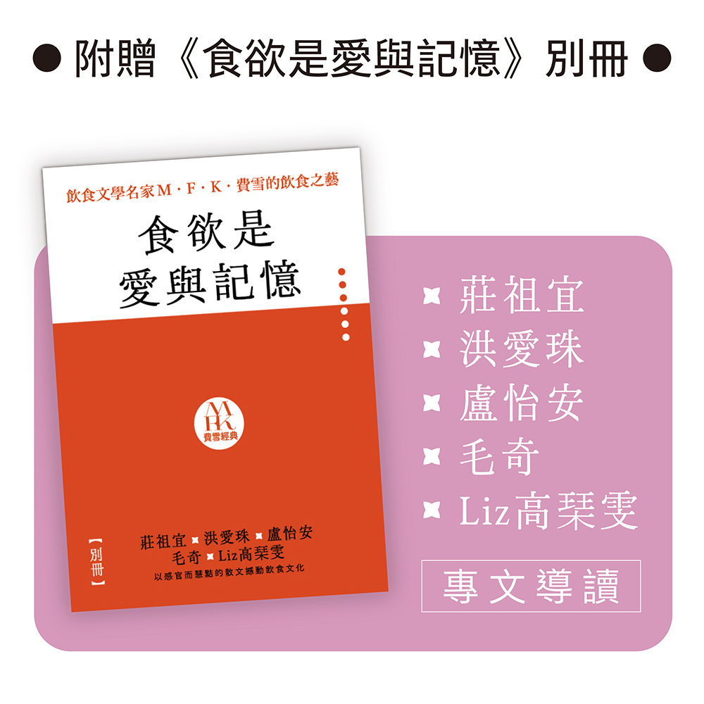 ▋套書附贈導讀別冊:精心收錄五位台灣飲食作家導讀,深入引介費雪的飲食書寫特色與魅力;同時收錄三篇《飲食之藝》美國版序言,以及費雪本人於1990年親自撰寫的作者序,完整呈現費雪的人生與飲食觀。