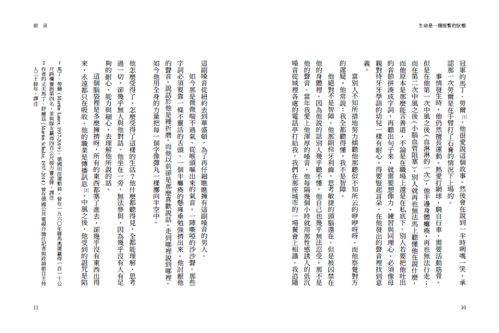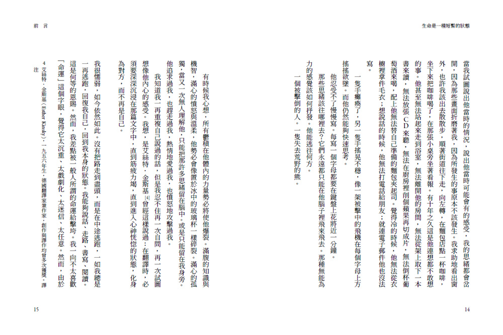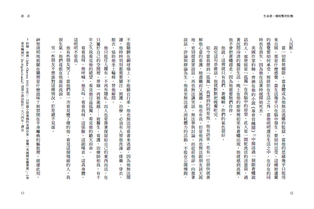 在《生命是一種短暫的狀態》中,長篇書信、日記與記憶交揉,呈現疾病對生活、關係與自我認知的深層衝擊。作者記錄了長期照護中的矛盾與張力──照顧與冒犯的界線、幫助與剝奪的兩難、控制與尊嚴的衝突。她檢視自己的角色轉變,思考「內心的自由」在日復一日的依存關係中是否仍然可能,也深切感知到個體如何在肉身限制中持續追求行動、語言與選擇的空間。