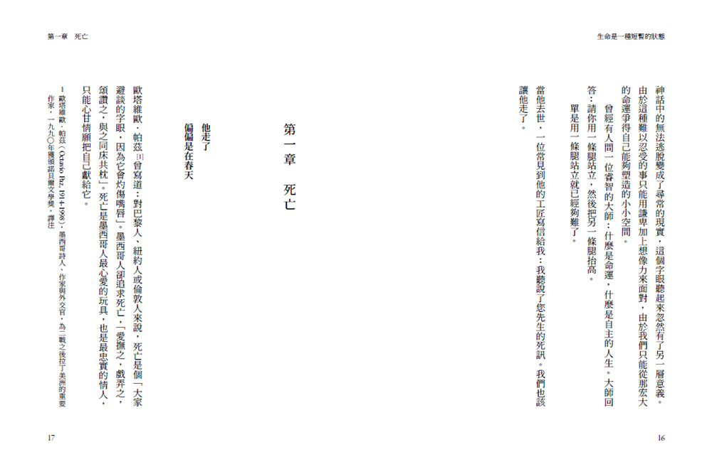 在當代社會,長壽與慢性病共存已成普遍經驗,長期照護與喪偶後的生活重建,更是許多人遲早要面對的議題。《生命是一種短暫的狀態》不僅是私人經驗的書寫,更是一份觀察與思考的文本,提醒我們在有限與不確定中,持續維繫對生活的關照與參與。本書是一部關於失落、適應與再出發的回望,讓人意識到,生活的完整並非來自確定的答案。