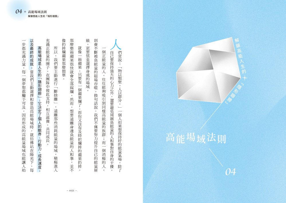 本書從「斷捨離人際關係」到「建構心流引力場」,從「低谷期能蓄能法則」到「高維決策心法」,作者逐層開啟──保持高能量法則的祕密,並將一個個看似艱深難懂的定律及法則以故事巧妙呈現,對理解人性及了解社會、商業的潛規則有極大的幫助。