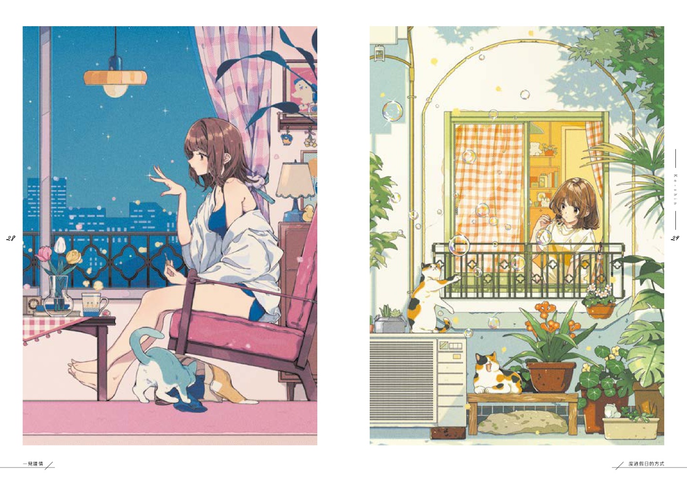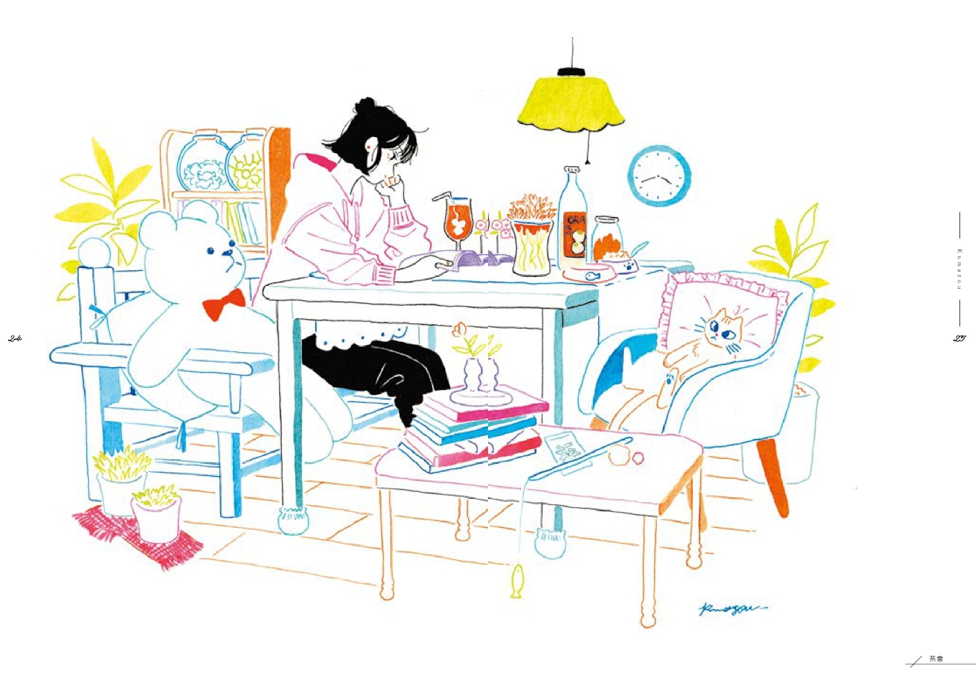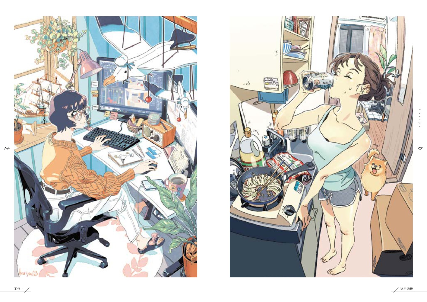 我會先構思概念,像這次的主題是「有龍相伴的奇異生活」。然後會決定房間的構圖,接著上色。我經常找妻子討論插畫的概念,統整出結論後才動筆。如果我沒問她的意見就開始畫圖,她還會抱怨(笑)。我也經常請教妻子,女孩子的髮型或服裝要怎麼畫比較符合現在的流行。