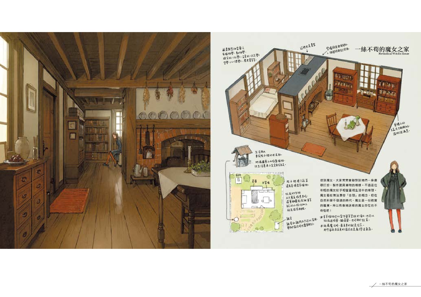 〈一絲不苟的魔女之家〉這幅畫,我刻意將魔女的房間描繪得有條有理。魔女的房間通常都給人一種東西一大堆、亂糟糟的印象不是嗎?所以我刻意畫成乾淨的模樣,希望創造出一種反差的樂趣。